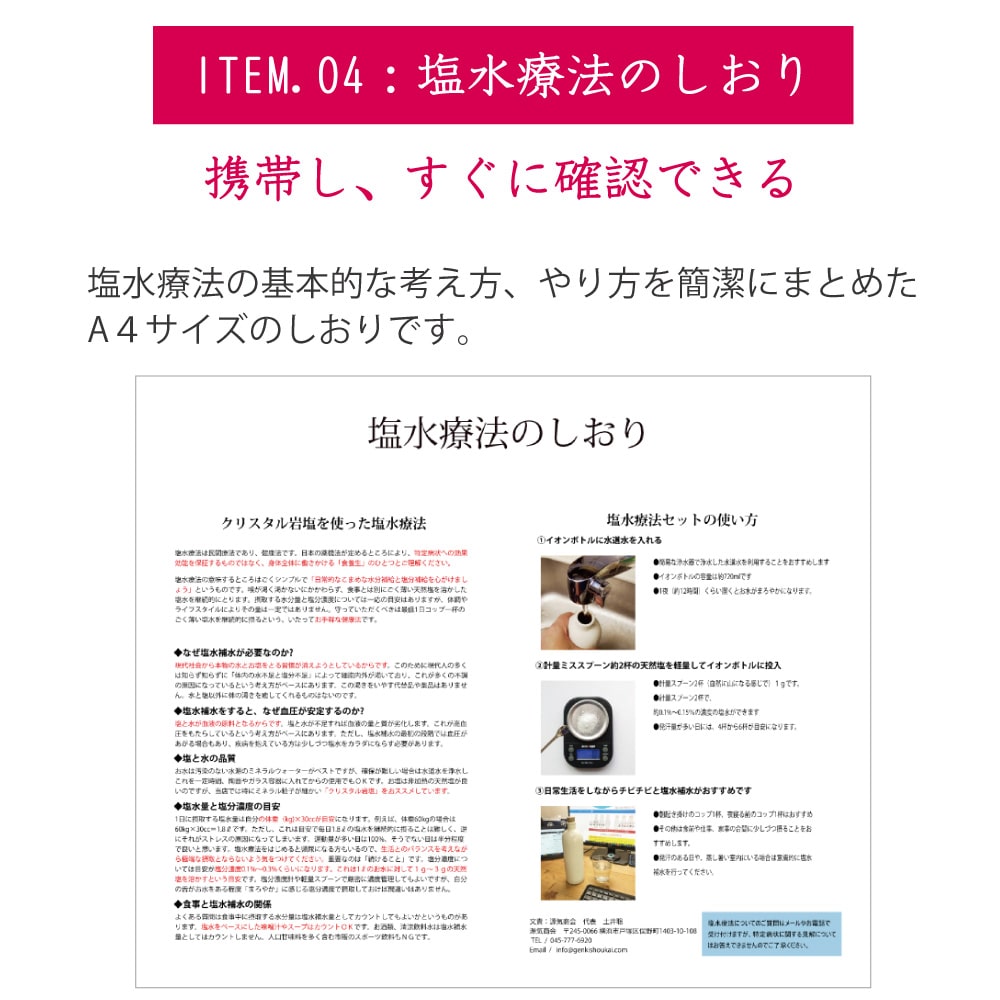 楽天市場 送料無料 源気商会 塩水セット 塩水療法 チラシ付 クリスタルソルト 計量スプーン 1g 小さじ イオンボトル ラジウムボトル 信楽焼 高血圧 アトピー 免疫力 免疫アップ 塩水補水 塩水生活 健康法 塩 岩塩 クリスタル岩塩 塩水 健康 うがい こだわりの塩